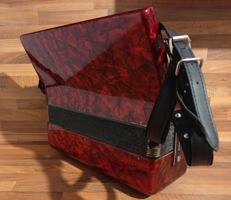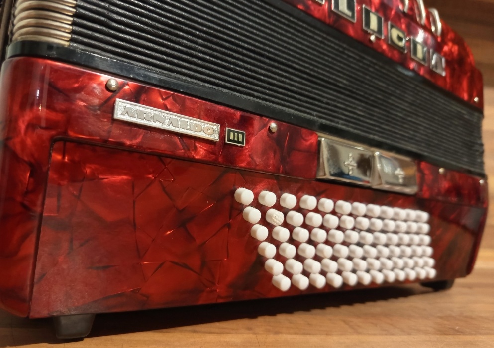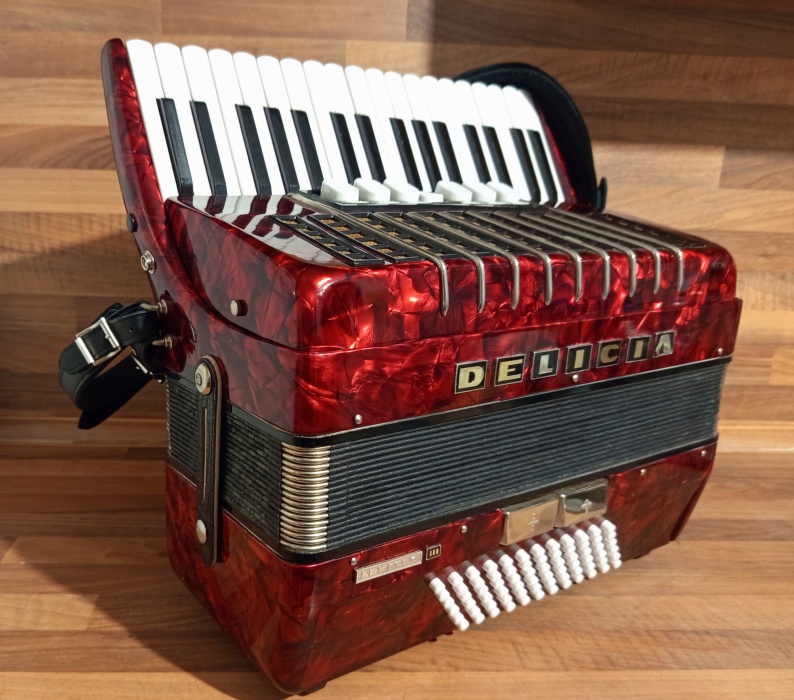 Akordeon Delicia Arnaldo. 72 basů, 7+2 rejstříků. Harmonika ve velice pěkném stavu. Přes svůj rozsah se jedná o lehkou harmoniku - ideální na hraní ve stoje. Vhodné pro začínající i pokročilé. Obal součástí.