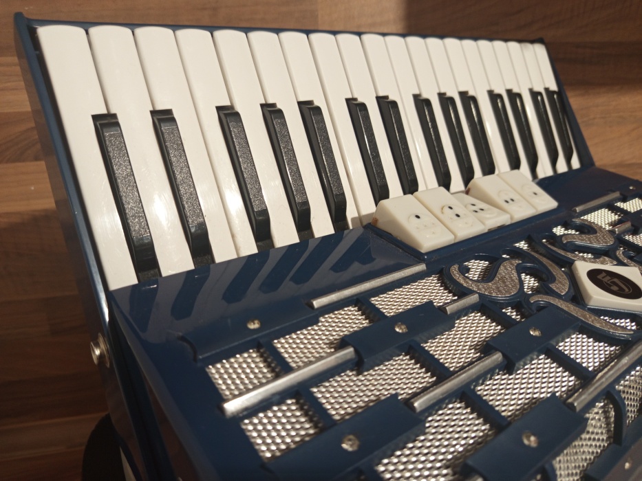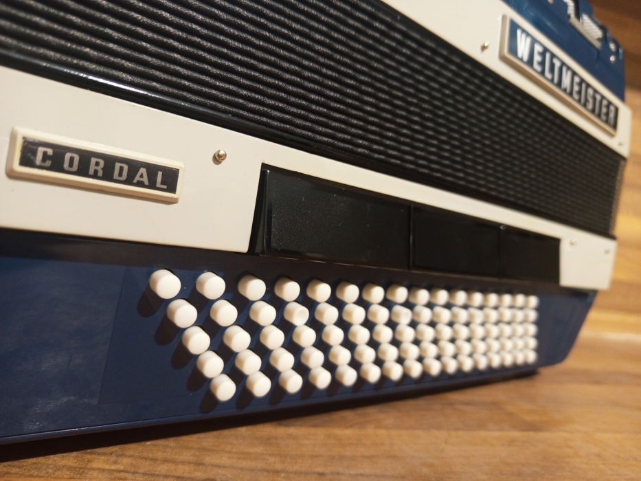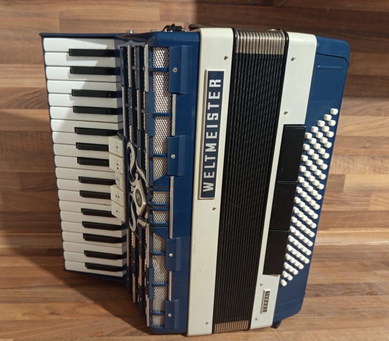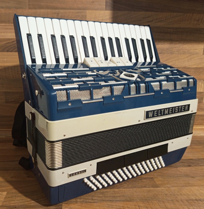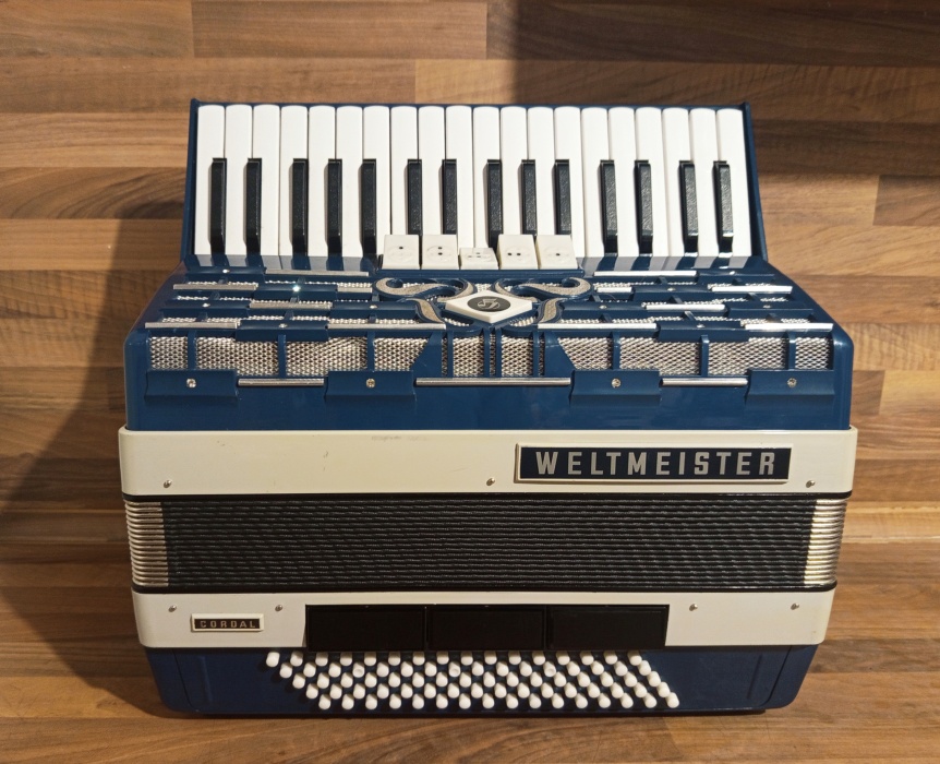 Akordeon Weltmeister Cordal ve velice pěkném stavu. 80 basů, 5 rejstříků v melodické části, 3 v basech. Nádherný zvuk. Pevný kufr součástí. Nástroj vhodný pro začínající i pokročilé. Lehoučká harmonika - ideální na hraní ve stoje či pro dítě. Obal součástí.