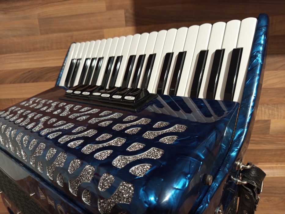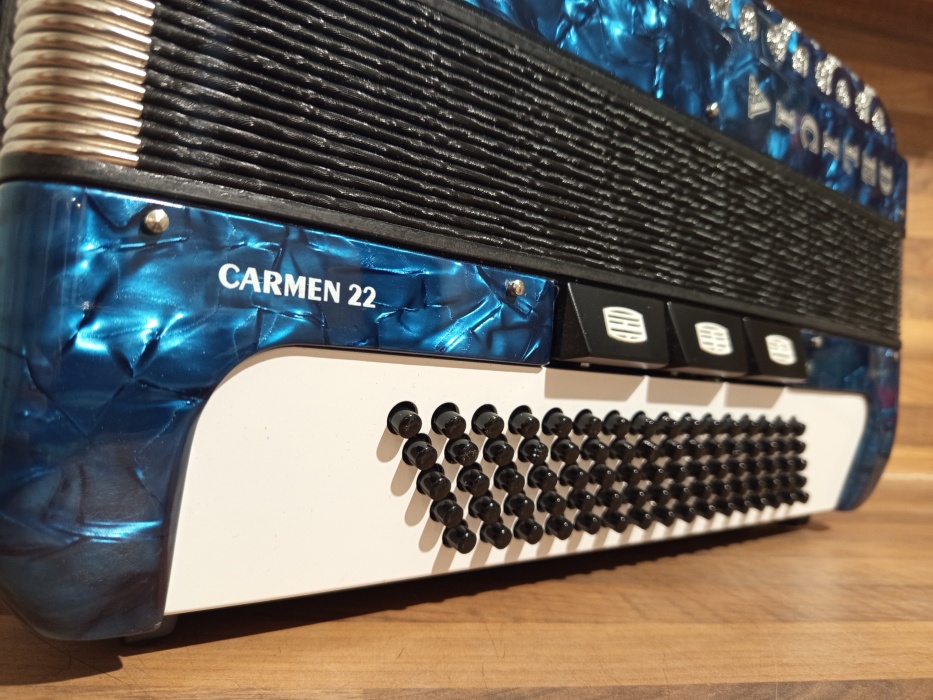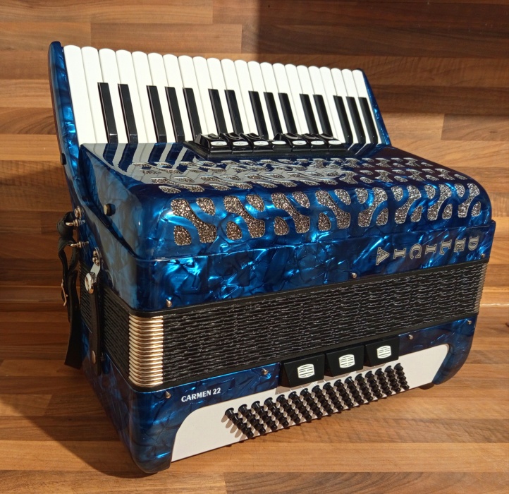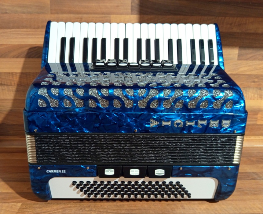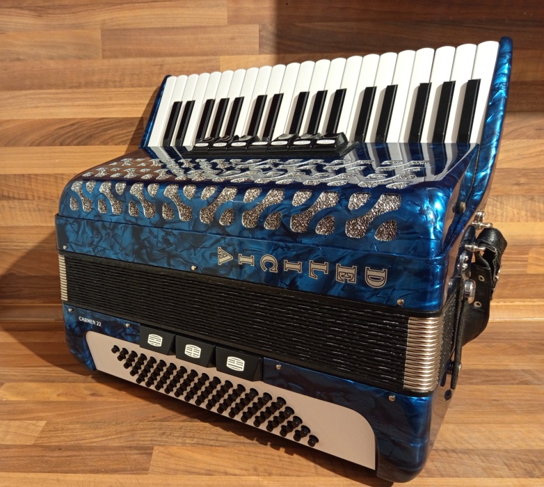 Akordeon Delicia Carmen 22, 80 basů. Harmonika kupována nedávno NOVÁ. Od té doby na ní nebylo téměř hráno. Je ve stavu nového nástroje - "voňavka". Cena v obchodě 68000 Kč. Včetně pevného kufru s klíčkem